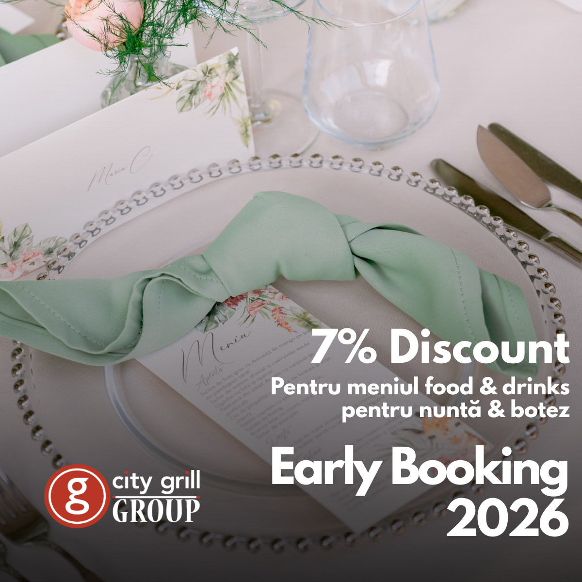 - Discount 7% la meniul de eveniment (meniu + pachet de băuturi)